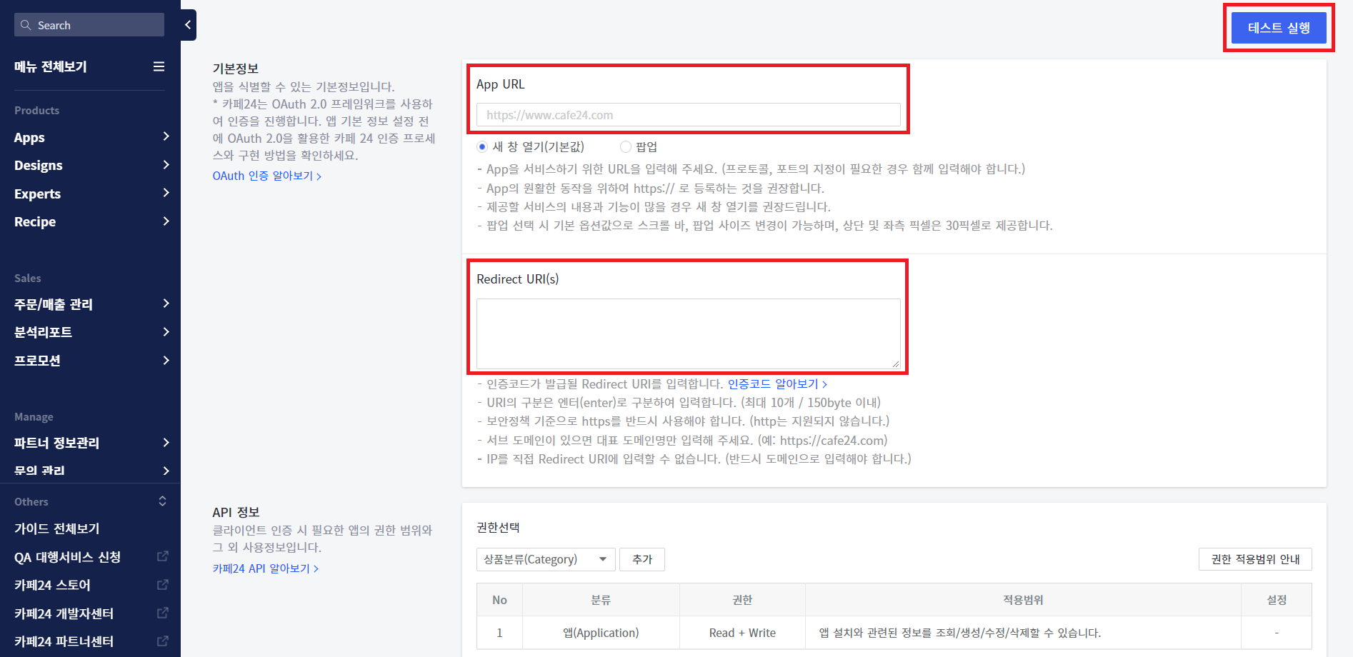 - Redirect URI(s): 인증 과정에서 쇼핑몰 운영자가 정보 제공 동의를 했을 때 인증 코드를 반환받는 경로입니다. 이 인증 코드를 사용하여 액세스 토큰을 발급받을 수 있습니다.