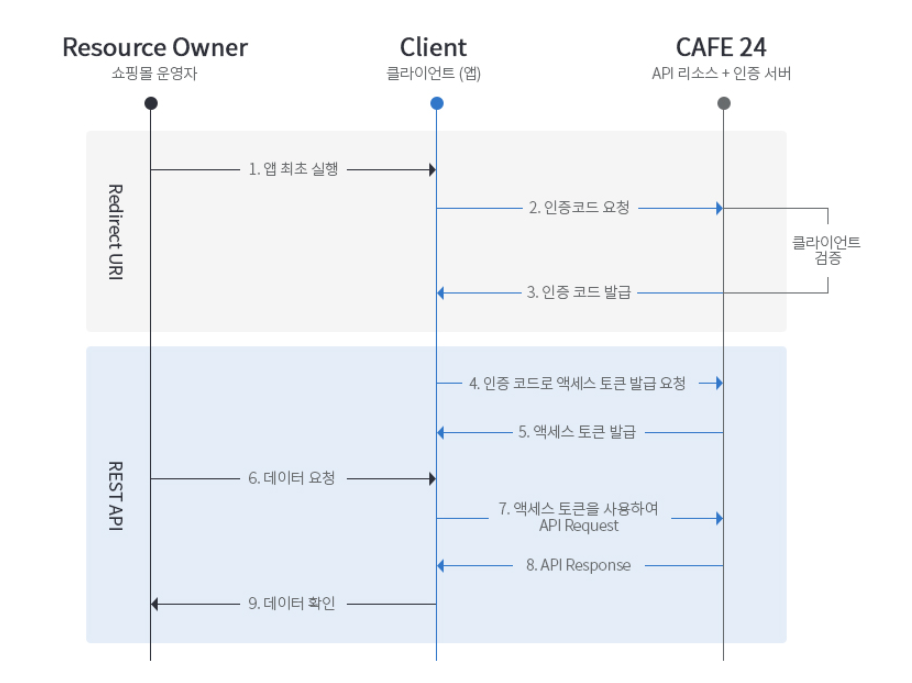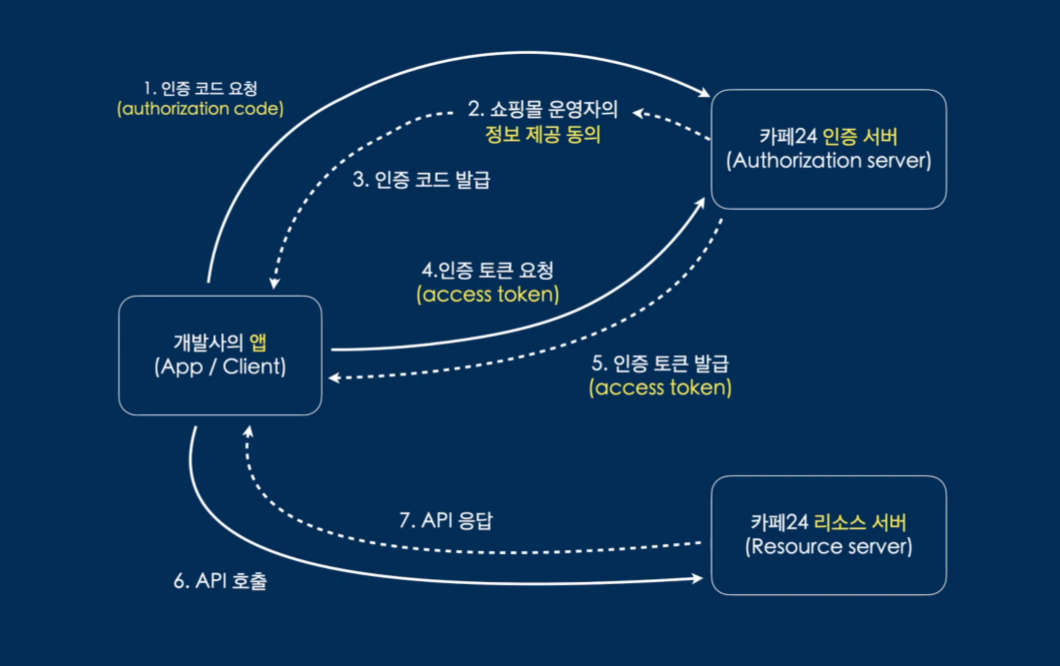 Cafe24에서 사용하는 OAuth 2.0 기반의 인증 프로세스를 단계별로 살펴보면 다음과 같습니다.