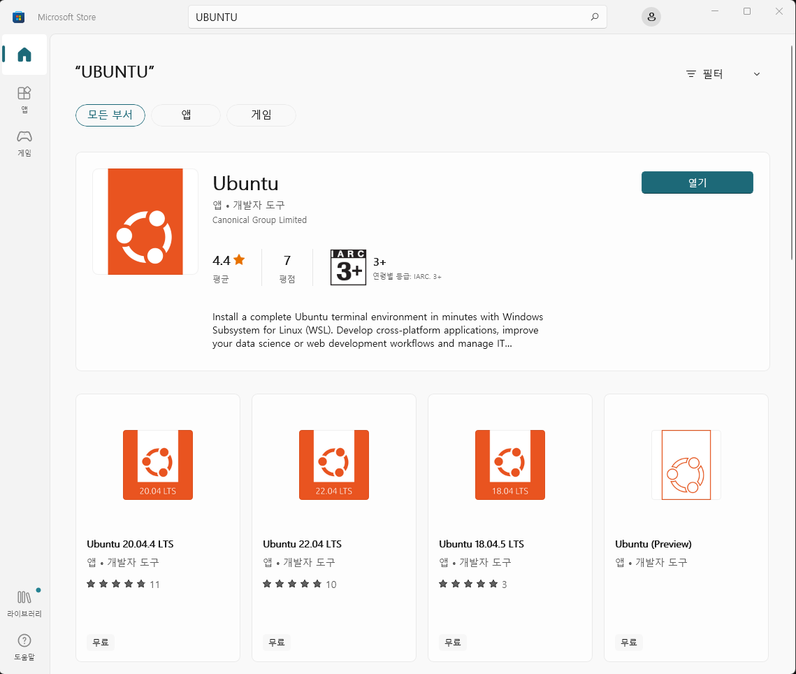 그 다음에 'Microsoft Store'에서 'Ubuntu'를 검색해 설치해주었습니다.