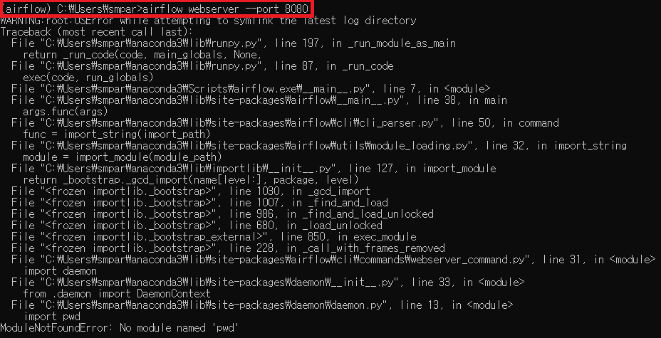 그래서 그냥 평소 작업하던대로 Windows에서 Anaconda로 가상환경을 설정한 후 Airflow를 실행해보기로 하였습니다. (무지했기 때문에 할 수 있었던 발상이었습니다..ㅎㅎ)